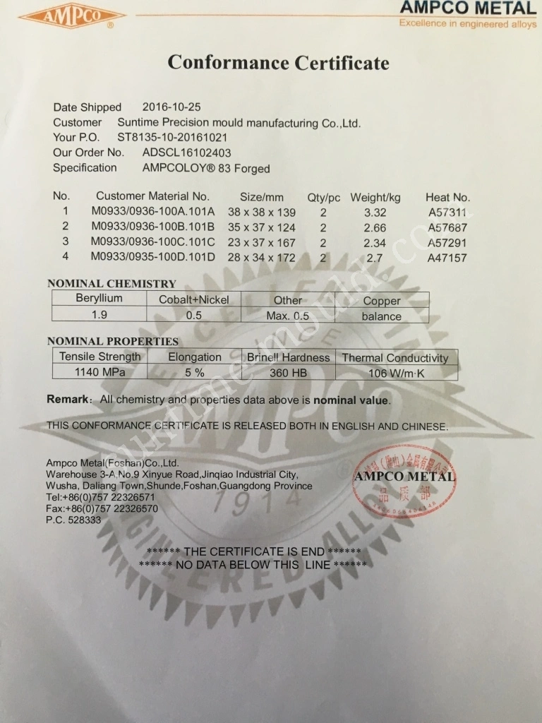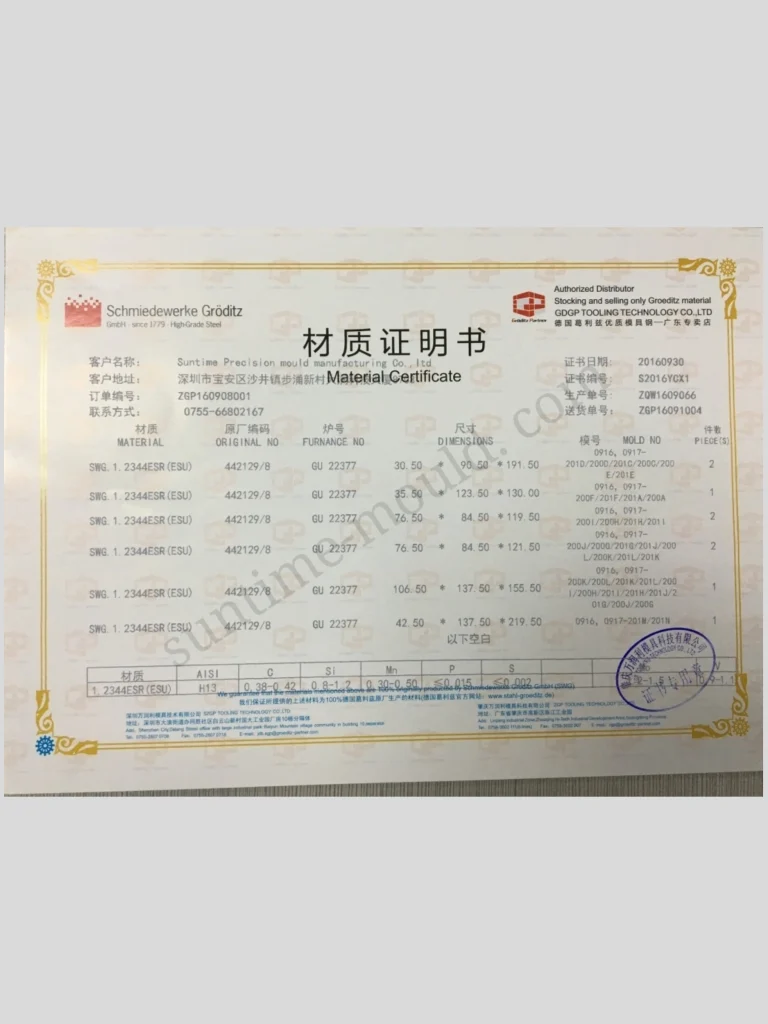 We are ISO 9001 certificated, having complete QC working flow and related documents such as FAI report, CPK report, Electrode / sample / mould inspection report, mold delivery check list, Mold trial report, moulding parameter report, IQC, IPQC report and OQC report… all these documents assure the molds and parts quality under control.