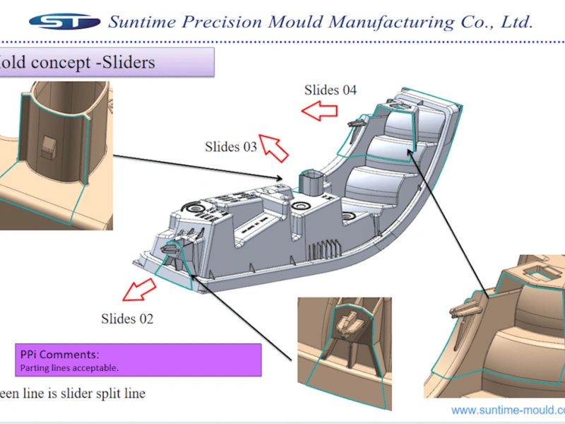 • Minimize the number of parting lines. Parting lines are where two halves of the mold meet. The more parting lines there are, the more expensive the mold will be.